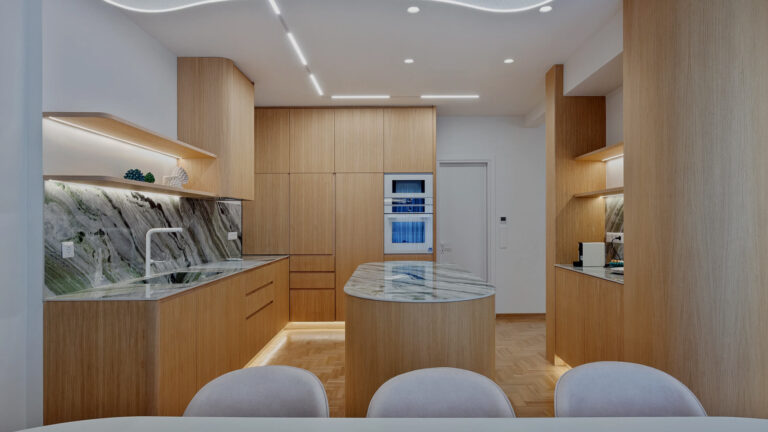 The area in which the apartment is situated was the heart of Athenian middle-class life in the 1960’s, so the design’s main goal was to preserve the property’s characteristics and identity. The old and the new are coming together through minimal lines and warm materials, such as the wood found in the kitchen and the walk-in closet — perfectly matched with the cool colors in the lobby and the marble and metal in the bathroom, creating overall a harmonious result.